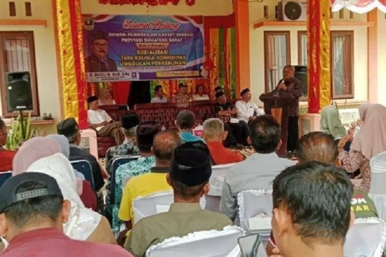kilaskabar.com- Anggota Komisi IV DPRD Provinsi Sumatera Barat, Muzli M. Nur mensosialisasikan Perda No.3 Tahun 2023 Tentang Tata Kelola Komoditas Unggulan Perkebunan dan Pertanian di halaman Kantor Wali Nagari Tanjung Baringin, Lubuk Sikaping, Minggu (24/8).