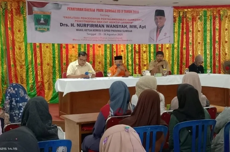 kilaskabar.com- Wakil Ketua Komisi V DPRD Sumbar, Nurfirman Wansyah menggelar sosialisasi Peraturan Daerah (Perda) Nomor 9 Tahun 2018 tentang Fasilitasi Pencegahan Penyalahgunaan Narkotika, Psikotropika dan Zat Adiktif (NAPZA) di Wisma Umi Kalsum, Kecamatan Sungai Pagu, Kabupaten Solok Selatan, Senin (25/8).