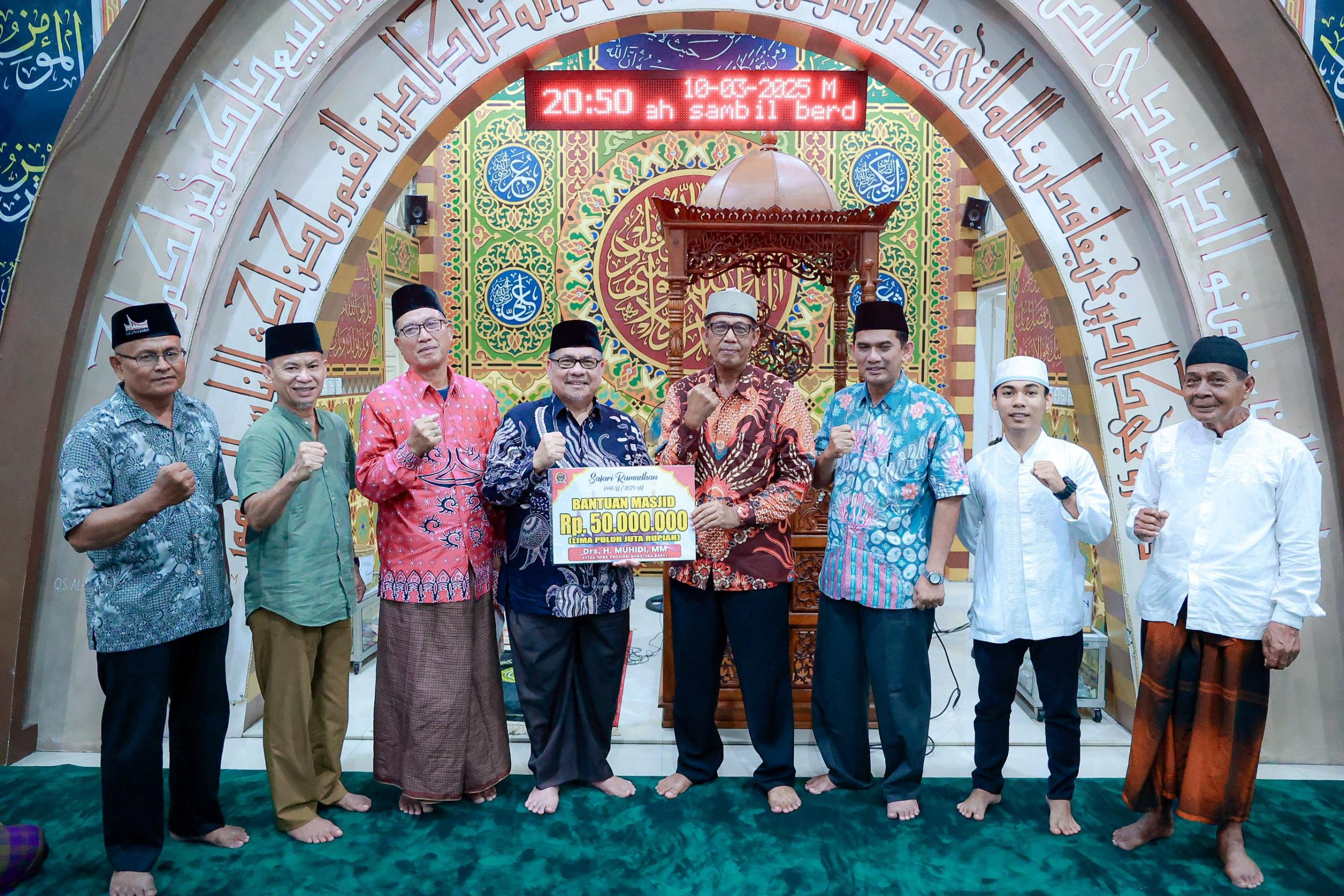 Kegiatan Safari Ramadhan Ketua DPRD Sumbar Muhidi menyerahkan secara simbolis, bantuan hibah pembangunan masjid sebesar Rp. 50 juta, yang diterima pengurus Masjid Darussalam komplek Cendana Mata Air Padang.