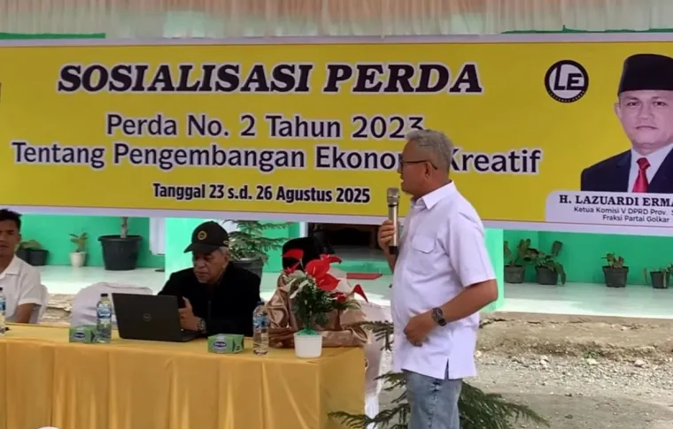 kilaskabar.com– Anggota DPRD Sumbar, Lazuardi Erman melaksanakan Sosialisasi Peraturan Daerah (Sosperda) di Matur, Kabupaten Agam, Minggu (24/8/2025). Kegiatan ini mengangkat Perda No. 2 Tahun 2023 tentang pengembangan ekonomi kreatif.