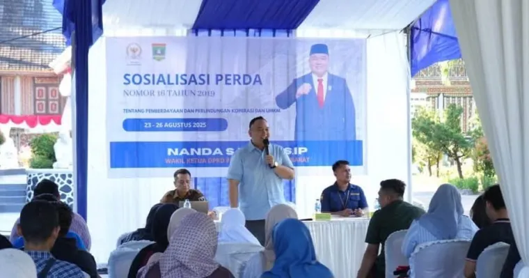 kilaskabar.com- Wakil Ketua DPRD Provinsi Sumatera Barat, Nanda Satria melaksanakan kegiatan Sosialisasi Peraturan Daerah (Perda) Nomor 16 Tahun 2019 tentang Pemberdayaan dan Perlindungan Koperasi dan Usaha Mikro, Kecil, dan Menengah (UMKM) di Daerah Pemilihan Sumbar I Kota Padang, Senin (25/8).